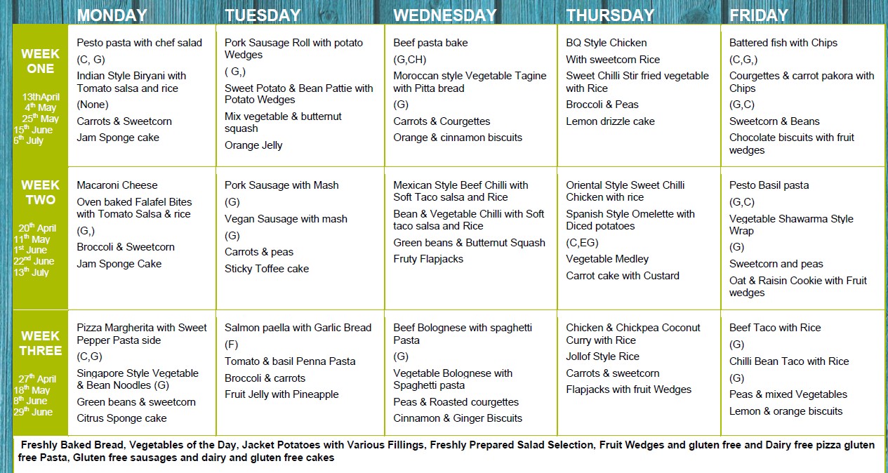 We cater for all dietary requirements and every day we offer a choice between vegetarian and meat. Every week we have the ever popular Fishy Friday where the pupils enjoy different types of fish, freshly oven cooked chips and peas or beans.